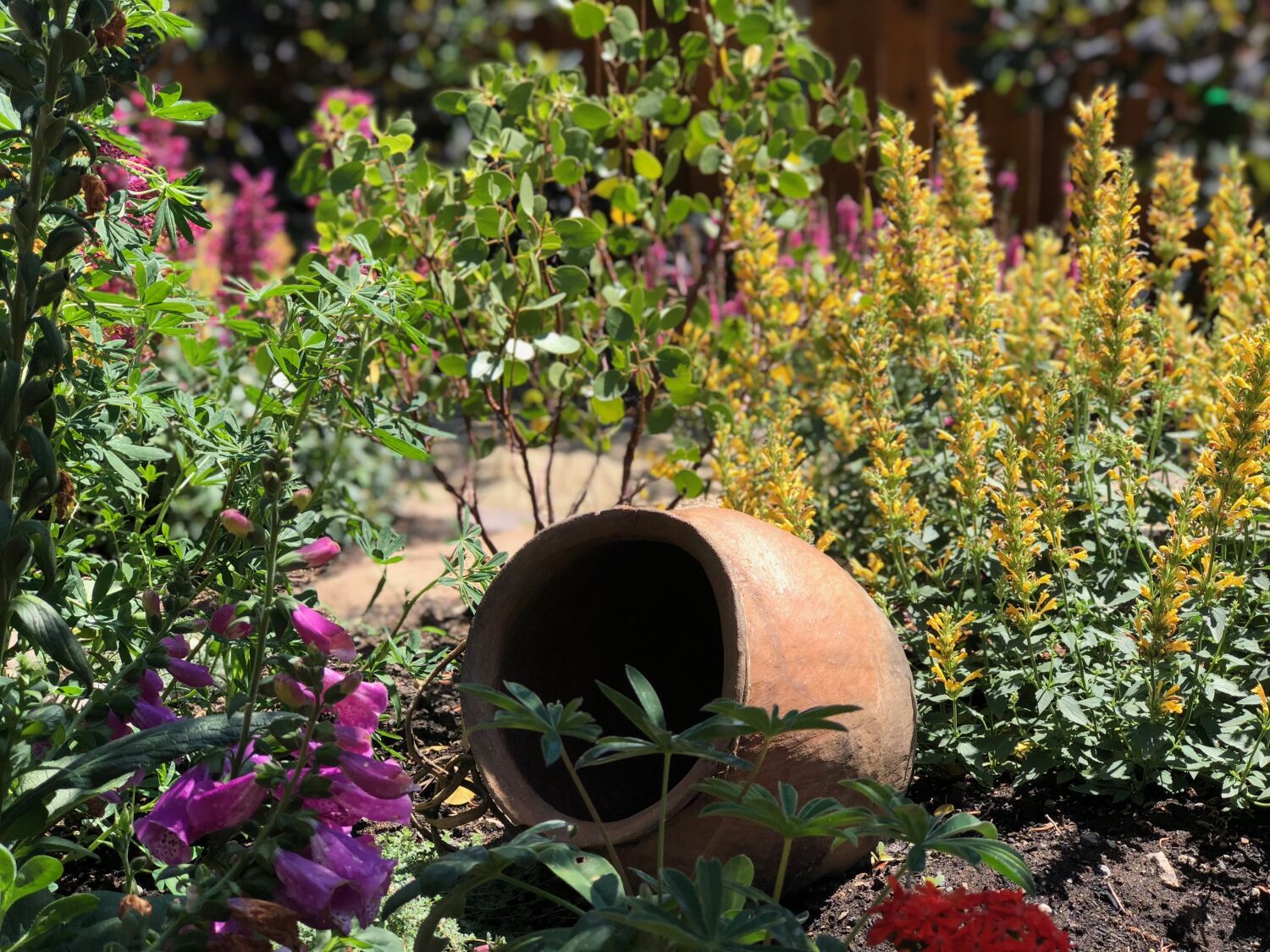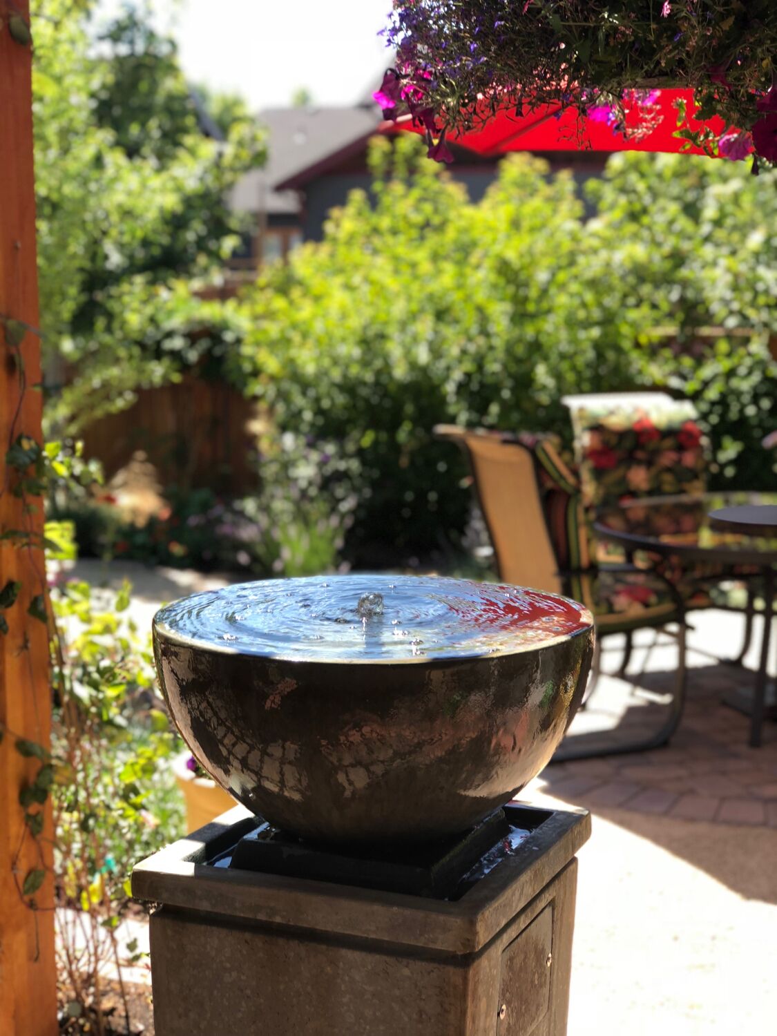 This small backyard has a bold, southwestern flare. The paver-lined, crushed granite walkway kept the project cost down for the client (as opposed to a full paver walkway) and also provided an easy flow throughout the garden.