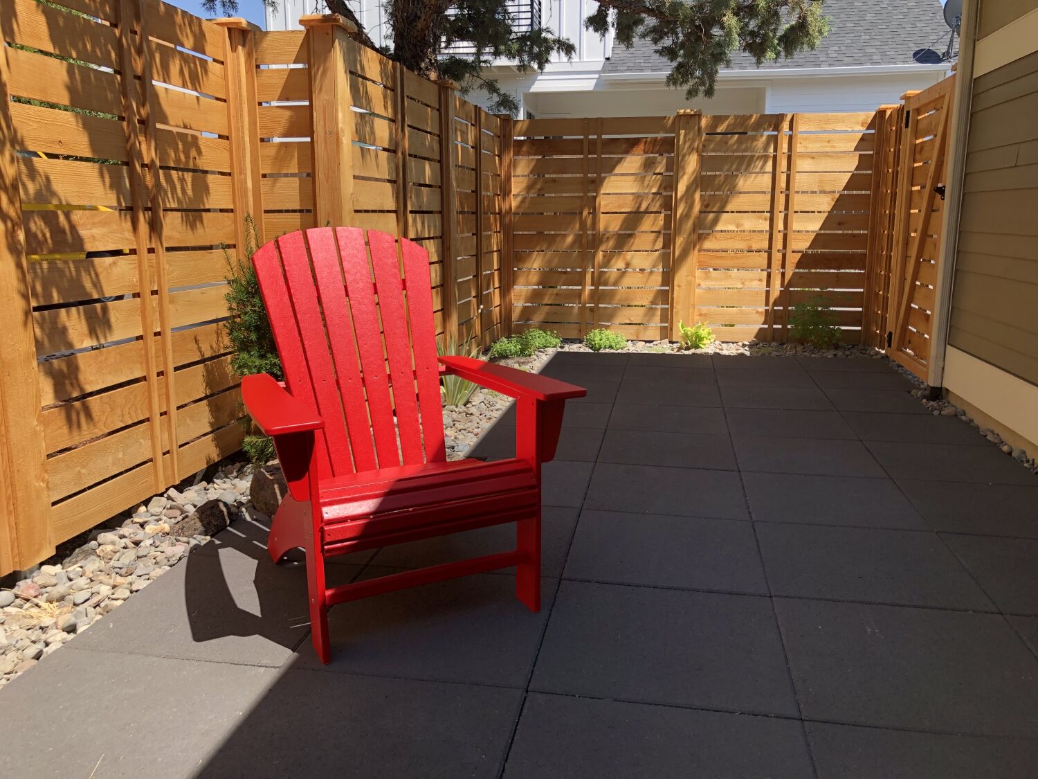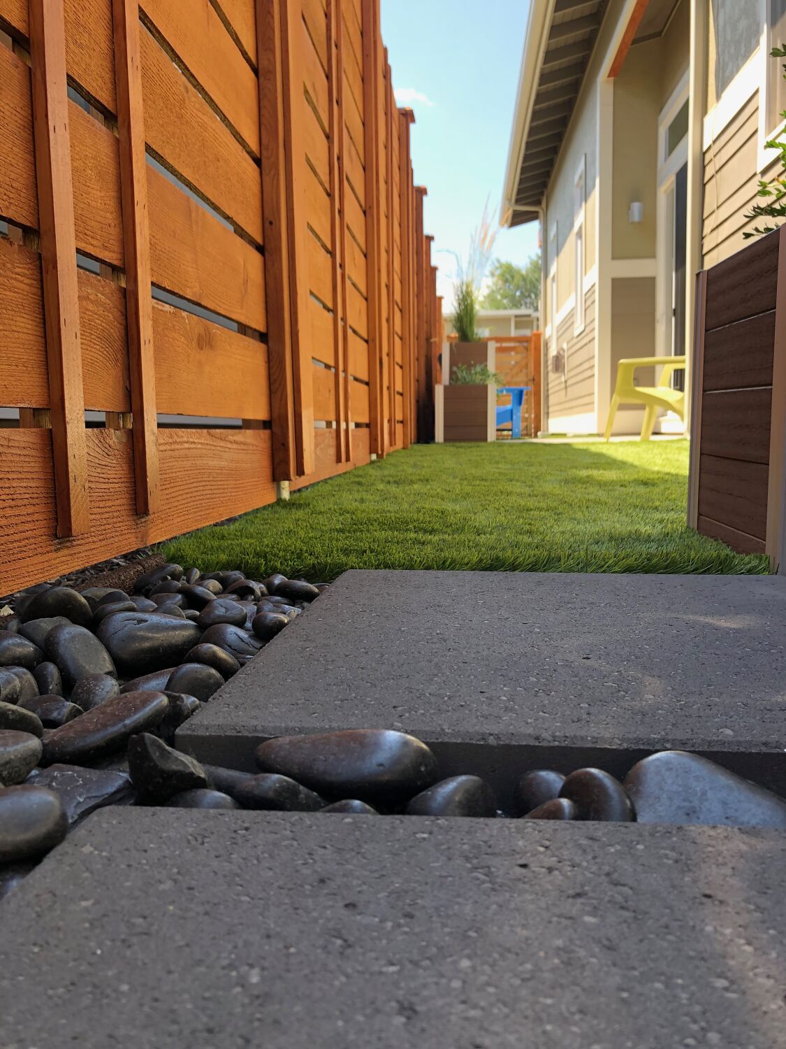 This modern space offers maximum outdoor living for the homeowners on their compact lot with minimum maintenance. Includes 2' x 2' paver slabs, Mexican beach pebble and river rock mulch, drought tolerant plant material, drip irrigation, and synthetic lawn.